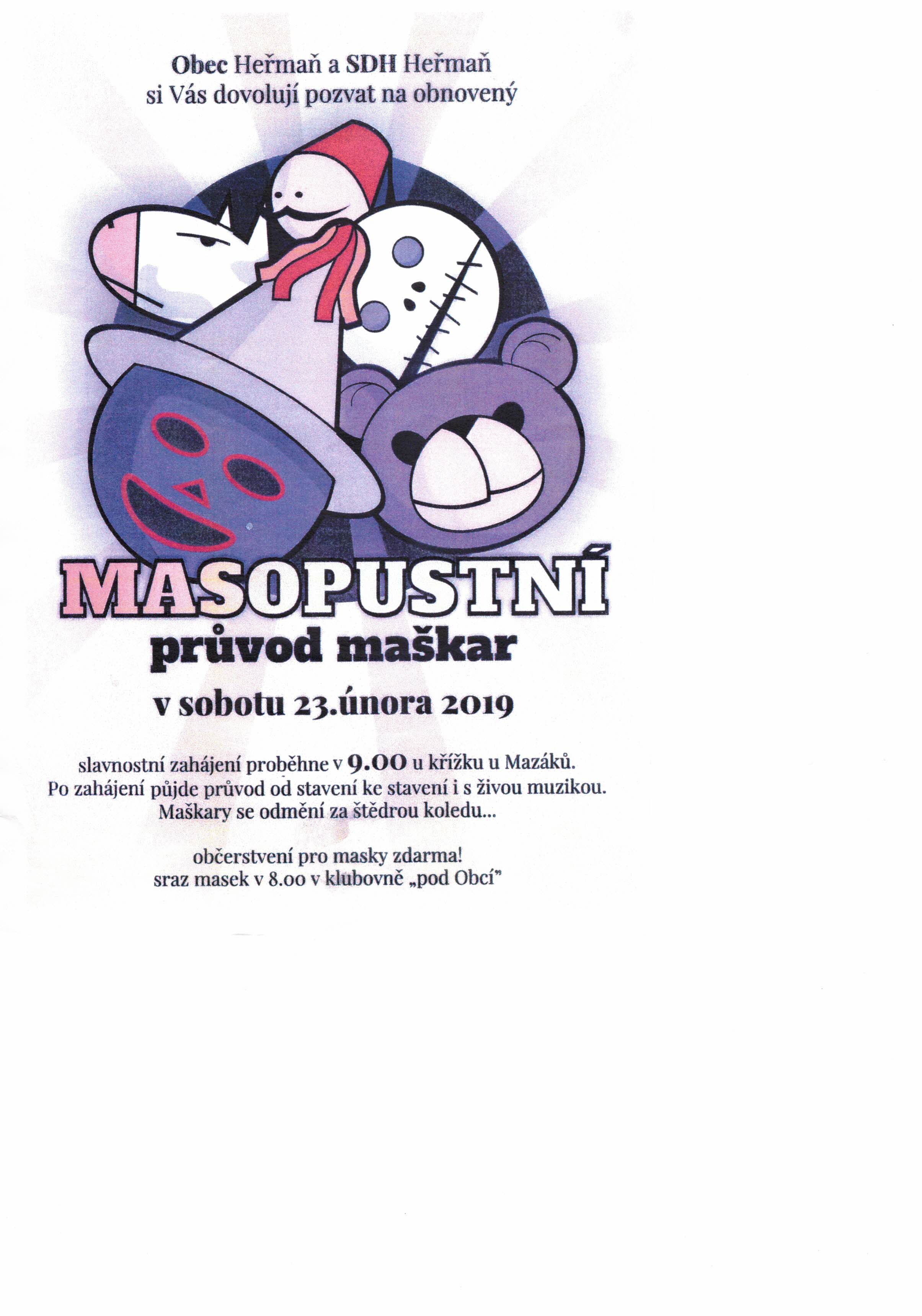 Obec Heřmaň a SDH Heřmaň si Vás dovolují pozvat na obnovený Masopustní průvod maškar v sobotu 23. února 2019.